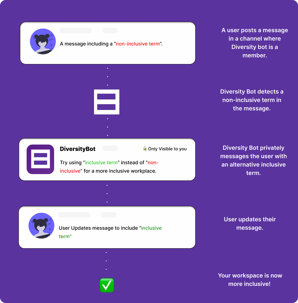 Diversity bot helps improve inclusive language at scale by detecting non-inclusive language and making suggestions. Our comprehensive list of 500 non-inclusive phrases and diversity calendar are the best resource for educating your team on diversity and inclusive language.